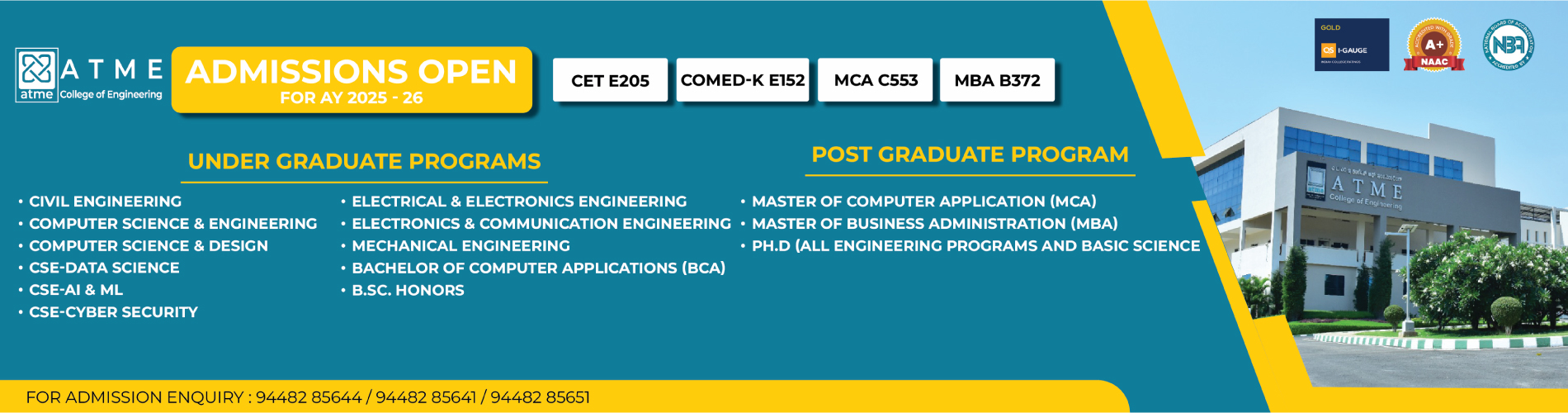 ATME College of Engineering Mysuru, established in 2010, is recognized by AICTE New Delhi and affiliated to Visvesvaraya Technological University, Belagavi, Karnataka. The college offers nine undergraduate programs and two postgraduate programs. The UG program is accredited for Civil Engineering, Computer Science, Electronics & Communication, Electrical & Electronics, and Mechanical Engineering Courses from the NBA.