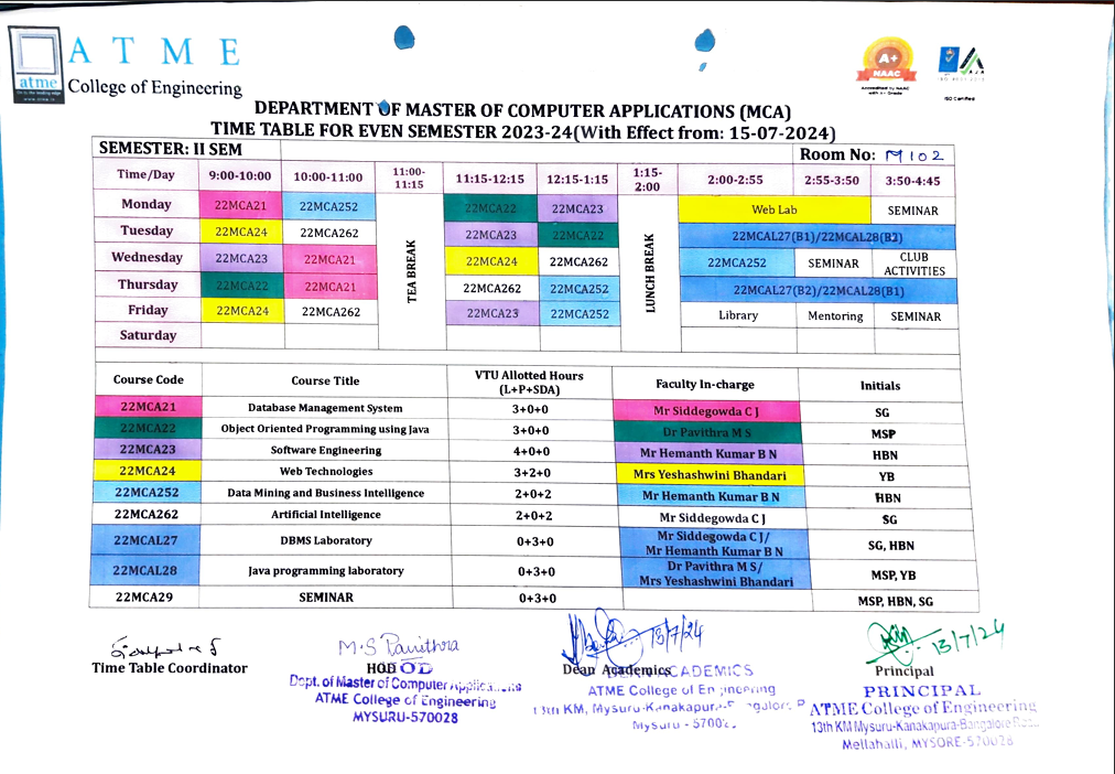 Academic TimeTable and Teaching Load (UG) Civil Engineering 3rd Sem_24-25_Time Table Computer Science and Engineering ACADEMIC TIME-TABLE CSE_TT_EVEN SEM_24-25 WORKLOAD CSE_24-25_EVEN_Workload.xlsx - CSE Work Load ATMECE_CSE_3rd Semester Time table_2024-25 Computer Science and Engineering - AIML ACADEMIC TIME-TABLE ATME_CSE-AIML_3rd semester time table ATME_CSE-AIML_3rd semester time table Computer Science and Engineering - Design Cyber Security and CSD 3rd Sem TT (1) Computer Science and Engineering - Cyber Security Cyber Security and CSD 3rd Sem TT (1) Computer Science and Engineering - Data Science ACADEMIC TIME-TABLE CSE_TT_AY_DS_2024-25(ODD) WORKLOAD CSE_ODD_WorkLoad_AY_24-25 Electronics and Communication Engineering ACADEMIC TIME-TABLE 3A & B TIME TABLE AY 24-25 V1. Timetable_2024-25_even_sem_ECE WORKLOAD workload_rotated 3A & B TIME TABLE AY 24-25 V1. Electricals and Electronics Engineering ACADEMIC TIME-TABLE III Semester Time Table_AY-2024-25 WORKLOAD EEE- Faculty workload_AY_2024-25 EEE- Faculty workload_AY_2024-25 III Semester Time Table_AY-2024-25 Mechanical Engineering ACADEMIC TIME-TABLE 3rd Sem Time Table WORKLOAD ATME_ME _Odd sem_ Workload_2024-25 ATME_ME _Odd sem_ Workload_2024-25 3rd Sem Time Table Academic TimeTable and Teaching Load (PG) Master of Computer Applications (MCA) ACADEMIC TIME-TABLE WORKLOAD Workload-IISEM Workload-IISEM
