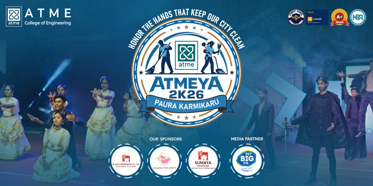 The Annual Cultural Fest ATMEYA 2K26 of ATME College of Engineering will th th be celebrated on 10 and 11 April 2026 with the meaningful theme “Honor the Hands that Keep Our City Clean.” This theme highlights the impoance of recognizing and appreciating the invaluable contributions of sanitation workers who tirelessly work to maintain cleanliness, hygiene and public health in our city. The fest aims to instill a sense of social responsibility, gratitude and respect among students by acknowledging the dedication and hard work of those who oen remain unnoticed in society. Through various cultural programs, awareness activities and student-led initiatives, the event will emphasize the dignity of labor and the impoance of community paicipation in keeping our surroundings clean and sustainable.