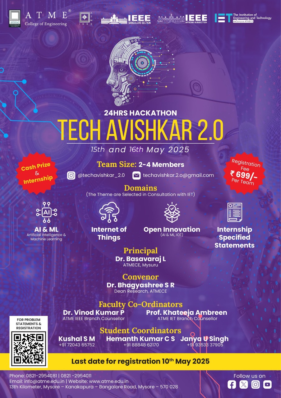 👨‍💻 Whether you’re a coding pro or a curious beginner, TechAvishkar 2.0 at ATMECE, Mysuru, promises an electrifying environment filled with creativity, collaboration, and continuous learning.