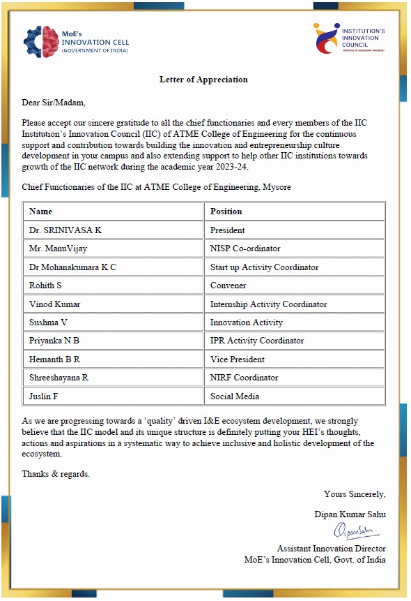 The Ministry of Education (MoE), Govt. of India has established ‘MoE’s Innovation Cell (MIC)’ to systematically foster the culture of Innovation amongst all Higher Education Institutions (HEIs). The primary mandate of MIC is to encourage, inspire and nurture young students by supporting them to work with new ideas and transform them into prototypes while they are informative years.